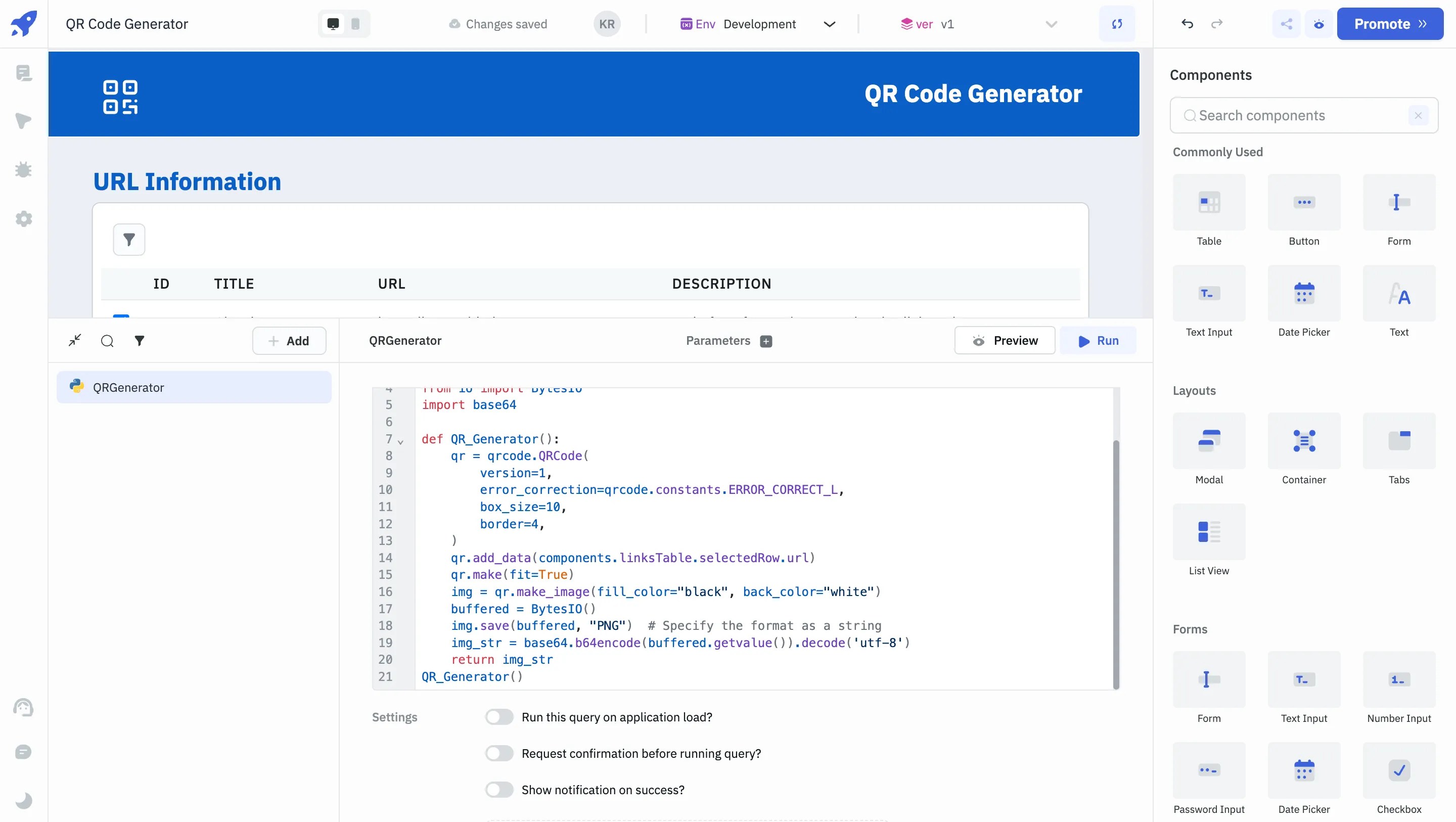 This quick tutorial will guide you through the steps to create a QR Code Generator application using ToolJet. The app will allow users to select a URL and generate a corresponding QR code. We will utilize ToolJet’s visual app-builder to rapidly build a user interface and then connect to a Python module to generate QR codes from URLs.